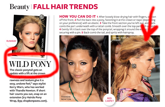 Hey, I’m not the only one who lovingly pokes fun at Sarah’s horsey good looks. Even the editors of InStyle —the respected fashion magazine— made subtle jokes about her equine-like face. In a piece devoted to hair trends they featured a photo of Ms. Parker. Of all the titles they could have used, they chose to call her hairdo the “Wild Pony.” Coincidence? I think not.